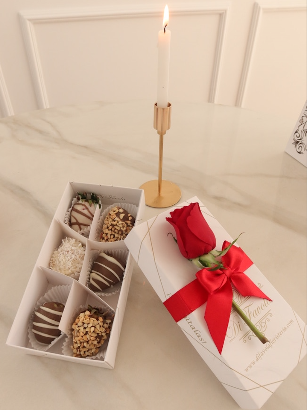 Caja pequeña x 6 fresas con chocolate blanco y negro dulce, surtido con toppings variados (mani, coco, pepitas y decorado).y 1 rosa